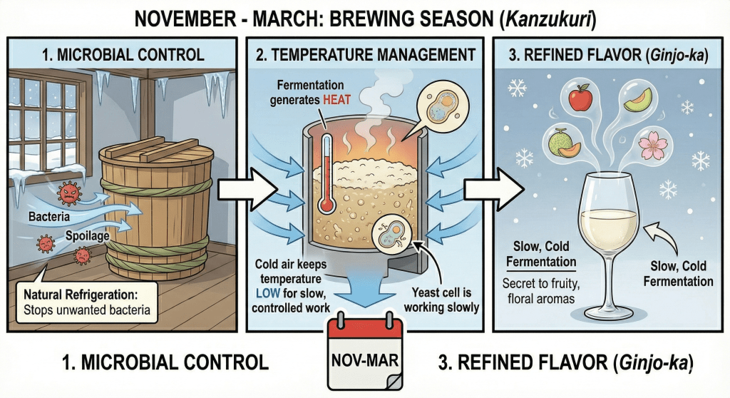 Why is sake brewed in winter? You might wonder, why work in the freezing cold? There are three scientific reasons: