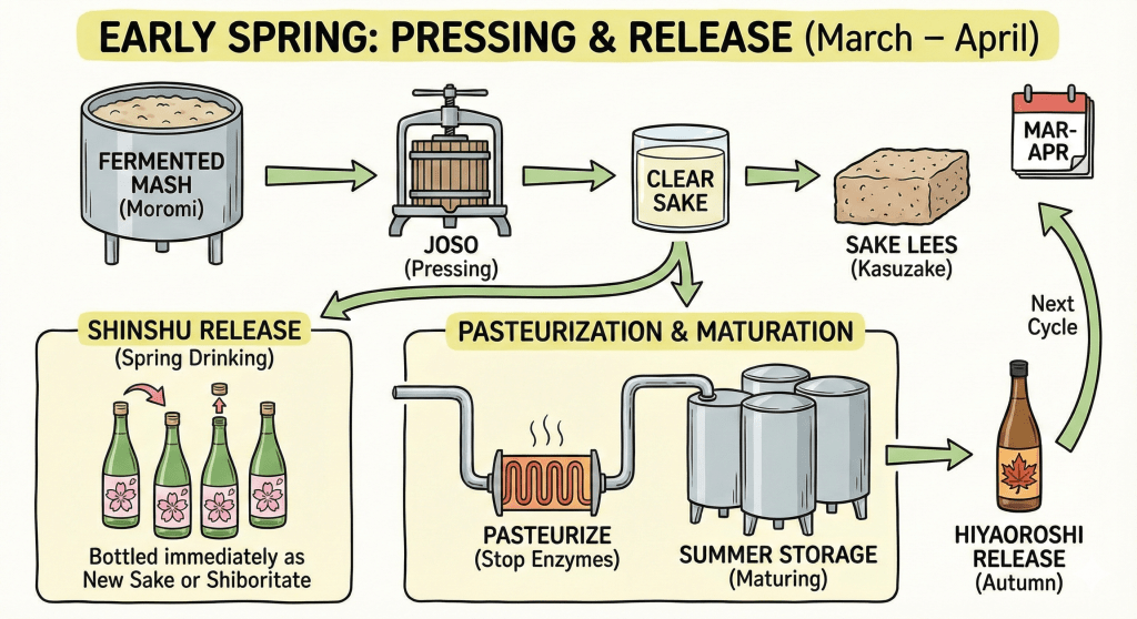 As winter ends, the fermentation finishes. The mash is pressed (Joso) to separate the clear sake from the rice lees (Kasuzake).