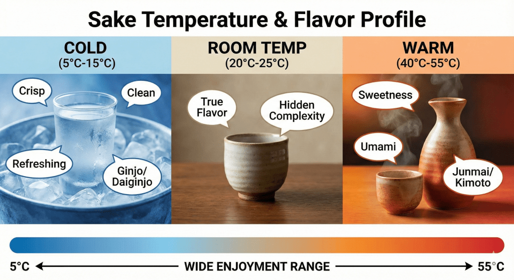 - Cold: Makes sake taste crisp, clean, and refreshing. (Good for Ginjo/Daiginjo).