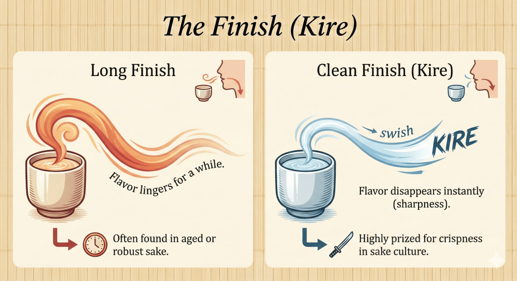 หลังจากกลืนลงคอไปแล้ว รสชาติยังค้างอยู่ในปากนานไหม? หรือหายวับไปทันที? ถ้าหายไปอย่างรวดเร็วและสะอาดเกลี้ยงเกลา ชาวญี่ปุ่นเรียกว่า “คิเระ” (Kire) หรือความคม ซึ่งถือเป็นเสน่ห์อย่างหนึ่งของสาเก