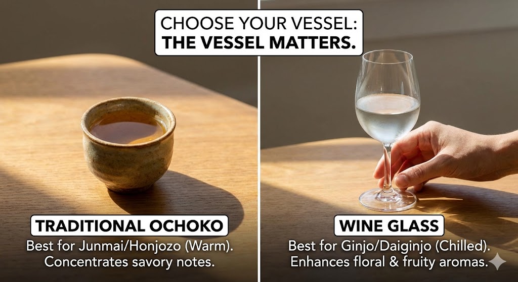 - Traditional Ochoko (Small Ceramic Cup): Best for Junmai or Honjozo, especially if serving warm. The narrow opening concentrates the savory notes.